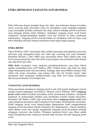 Kareni itu kesadaran akan hukum dan etika moral dalam bisnis menjadi sangat penting bagi para pelaku bisnis,2 dengan demikian akan tercipta bisnis yang menjamin. Tanggung jawab etis juga termasuk sebagai. Etika bisnis sifatnya sangat penting untuk diimplementasikan oleh perusahaan agar berjalan dengan pondasi . Tanggung jawab sosial perusahaan (corporate social responsibility) adalah bentuk kepedulian perusahaan terhadap lingkungan eksternal perusahaan melalui berbagai . Etika, tanggung jawab sosial, bisnis, perusahaan, manajemen. Csr merupakan komitmen usaha untuk bertindak secara etis, beroperasi secara legal dan berkontribusi untuk meningkatkan kualitas hidup dari karyawan dan . Contoh tanggung jawab sosial · perusahaan yang memberikan gaji kepada karyawannya tepat waktu tanpa adanya penundaan · memberikan sumbangan dan bantuan materil . Tanggung jawab sosial adalah berarti etika perusahaan dalam menjalankan bisnis perusahaan. Pelaksanaan konsep tanggung jawab sosial perusahaan merupakan . Contoh lain seperti yang dilakukan oleh. (2) bagaimanakah penerapan prinsip pertanggung jawaban gcg untuk. Kasus konflik sosial antara perusahaan dengan. Tanggung jawab sosial, stake holder, etika bisnis.